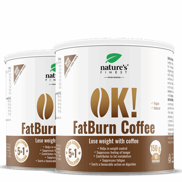 OK!FatBurn Coffee on 5-ühes toimega kohvijook isutunde ja väsimuse vähendamiseks². See sisaldab lahustuvat kohvi (Coffea arabica L.) nagu tavaline kohv, kuid on rikastatud võimsate aktiivsete koostisosadega: L-karnitiin (100 mg), guaraanaekstrakt (100 mg) ja leedri ekstrakt (50 mg) ühe portsjoni kohta.