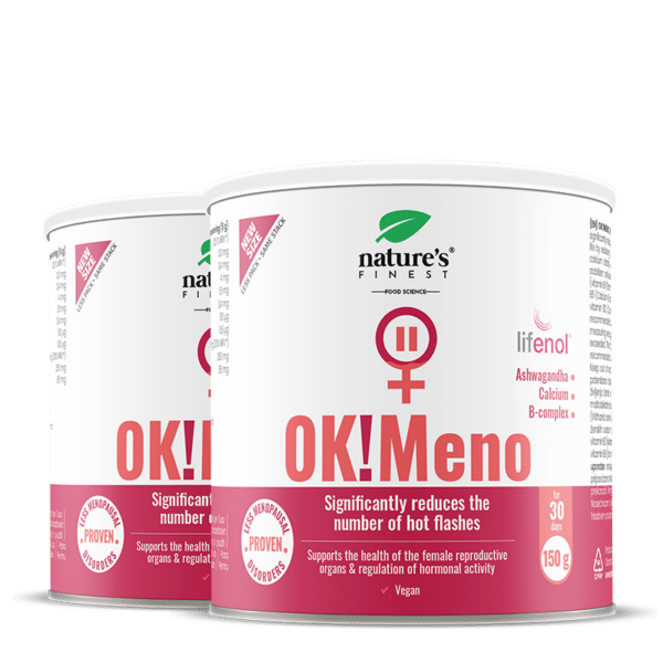 OK!Meno aitab menopausis naistel parandada elukvaliteeti 6 nädalaga¹*. See sisaldab patenteeritud Lifenol®-i, mis vähendab kuumahooge ja öist higistamist¹*, ashwagandhat emotsionaalseks toetuseks ning kaltsiumi luude tervise heaks – kõik ühes terviklikus, uuringutega toetatud valemis.
